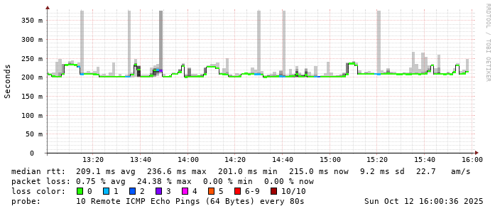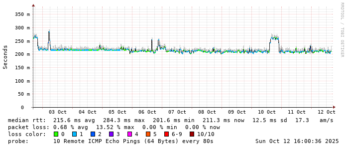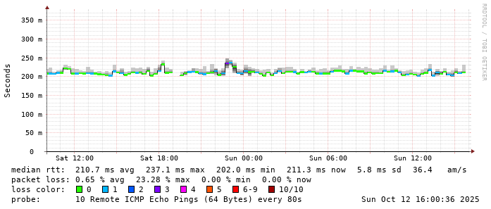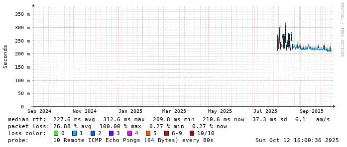 Start: 2025-10-12T04:58:55+0000HOST: ******** Loss% Snt Last Avg Best Wrst StDev 1. AS9678 103.98.75.193 0.0% 10 0.7 1.0 0.7 2.2 0.5 2. AS??? ??? 100.0 10 0.0 0.0 0.0 0.0 0.0 3. AS2914 ae-1.r25.taiptw01.tw.bb.gin.ntt.net 0.0% 10 0.8 0.6 0.5 0.8 0.1 4. AS2914 ae-10.r28.tkokhk01.hk.bb.gin.ntt.net 0.0% 10 20.5 20.5 20.4 20.8 0.1 5. AS2914 ae-6.r22.vienat02.at.bb.gin.ntt.net 0.0% 10 187.0 186.9 186.8 187.1 0.1 6. AS2914 ae-0.r23.vienat02.at.bb.gin.ntt.net 0.0% 10 186.9 186.9 186.7 187.0 0.1 7. AS2914 ae-12.r22.amstnl07.nl.bb.gin.ntt.net 0.0% 10 205.8 206.0 205.8 206.2 0.1 8. AS2914 ae-2.a01.amstnl07.nl.bb.gin.ntt.net 0.0% 10 212.9 212.9 212.8 213.1 0.1 9. AS2914 ae-0.kpn.amstnl07.nl.bb.gin.ntt.net 70.0% 10 214.1 214.2 214.1 214.2 0.0 10. AS??? ??? 100.0 10 0.0 0.0 0.0 0.0 0.0 11. AS??? ??? 100.0 10 0.0 0.0 0.0 0.0 0.0 12. AS3265 1273.irb.xrc.d12.xs4all.net 0.0% 10 207.9 210.3 207.9 222.5 4.3