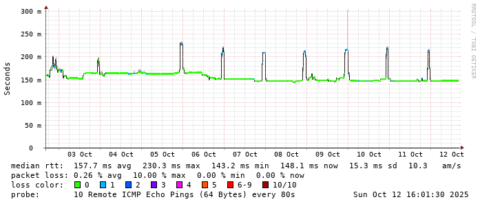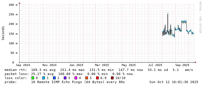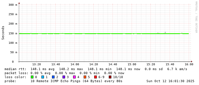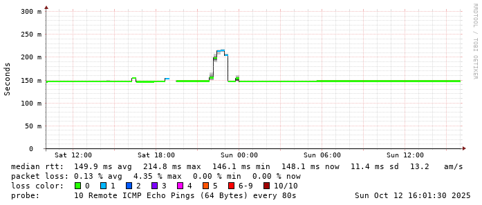 Start: 2025-10-12T04:59:13+0000HOST: ******** Loss% Snt Last Avg Best Wrst StDev 1. AS9678 103.98.75.193 0.0% 10 0.8 0.8 0.7 0.9 0.1 2. AS??? ??? 100.0 10 0.0 0.0 0.0 0.0 0.0 3. AS2914 ae-1.r25.taiptw01.tw.bb.gin.ntt.net 0.0% 10 0.6 0.7 0.6 1.1 0.1 4. AS2914 ae-4.a01.taiptw01.tw.bb.gin.ntt.net 90.0% 10 0.3 0.3 0.3 0.3 0.0 5. AS6453 ix-ae-29-0.tcore1.tj5-taipei.as6453.net 0.0% 10 0.8 0.7 0.5 1.8 0.4 6. AS6453 if-ae-7-2.tcore1.yig-taipei.as6453.net 0.0% 10 108.7 108.9 108.7 109.3 0.2 7. AS6453 if-bundle-6-2.qcore1.hk2-hongkong.as6453.net 80.0% 10 157.3 151.2 145.1 157.3 8.6 8. AS6453 if-bundle-5-2.qcore2.hk2-hongkong.as6453.net 80.0% 10 107.7 107.8 107.7 107.9 0.1 9. AS6453 if-bundle-32-2.qcore2.svw-singapore.as6453.net 80.0% 10 107.4 107.1 106.8 107.4 0.4 10. AS6453 if-bundle-34-22.qcore1.cxr-chennai.as6453.net 80.0% 10 106.3 106.0 105.7 106.3 0.4 11. AS6453 if-bundle-2-2.qcore2.cxr-chennai.as6453.net 60.0% 10 108.1 108.1 107.5 108.5 0.4 12. AS6453 if-bundle-34-2.qcore2.mlv-mumbai.as6453.net 0.0% 10 107.4 107.4 106.6 109.5 0.8 13. AS6453 if-ae-22-2.tcore2.mlv-mumbai.as6453.net 0.0% 10 106.7 108.4 106.5 121.7 4.7 14. AS6453 if-ae-2-2.tcore1.mlv-mumbai.as6453.net 0.0% 10 99.3 99.5 99.3 100.3 0.3 15. AS6453 if-be-13-2.ecore1.mlv-mumbai.as6453.net 90.0% 10 117.2 117.2 117.2 117.2 0.0 16. AS6453 116.0.84.131 0.0% 10 158.4 155.4 151.1 158.4 2.1 17. AS23752 pkr.cisco.core-htd.cisco.core 0.0% 10 146.6 146.7 146.5 146.9 0.1 18. AS23752 1-ftth.ntc.net.np 0.0% 10 148.1 148.2 148.1 148.2 0.0