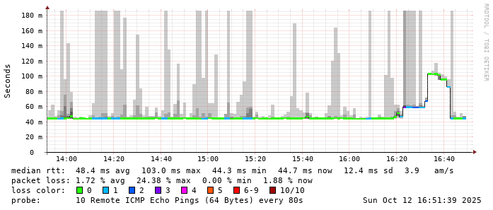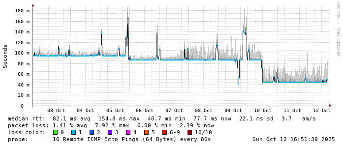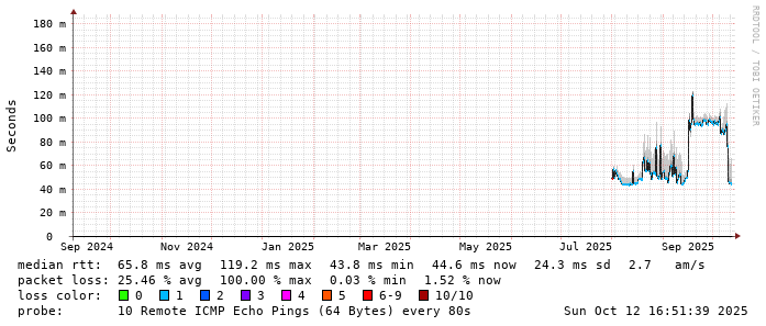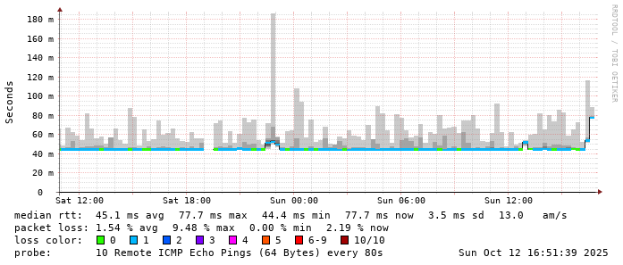Start: 2025-10-12T05:04:07+0000HOST: ******** Loss% Snt Last Avg Best Wrst StDev 1. AS9678 103.98.75.193 0.0% 10 1.0 1.1 0.8 2.1 0.5 2. AS??? ??? 100.0 10 0.0 0.0 0.0 0.0 0.0 3. AS2914 ae-1.r25.taiptw01.tw.bb.gin.ntt.net 0.0% 10 0.7 0.7 0.4 1.8 0.4 4. AS2914 ae-10.r28.tkokhk01.hk.bb.gin.ntt.net 0.0% 10 27.6 27.6 27.5 27.9 0.1 5. AS2914 ae-23.a01.chwahk03.hk.bb.gin.ntt.net 0.0% 10 27.8 28.5 27.8 32.1 1.3 6. AS2914 ae-0.pldt.chwahk03.hk.bb.gin.ntt.net 0.0% 10 30.7 28.7 28.2 30.7 0.7 7. AS9299 210.213.131.120.static.pldt.net 0.0% 10 53.4 48.8 44.0 54.9 4.2 8. AS9299 210.213.133.25.static.pldt.net 0.0% 10 48.6 48.5 48.2 48.8 0.2 9. AS9299 180.193.172.110 0.0% 10 37.0 37.1 36.9 37.4 0.1 10. AS7629 202.57.125.65 0.0% 10 44.6 44.4 44.3 44.6 0.1