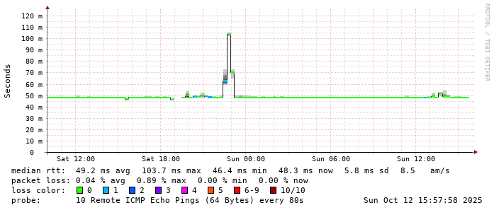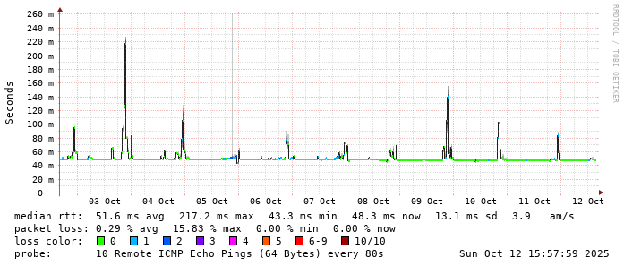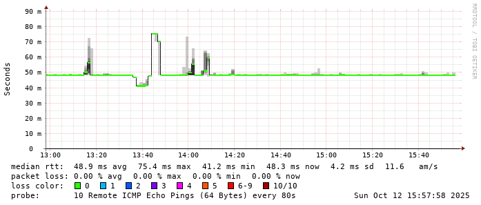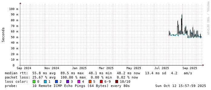 Start: 2025-10-12T05:02:05+0000HOST: ******** Loss% Snt Last Avg Best Wrst StDev 1. AS9678 103.98.75.193 0.0% 10 0.8 0.9 0.6 2.2 0.4 2. AS??? ??? 100.0 10 0.0 0.0 0.0 0.0 0.0 3. AS2914 ae-1.r25.taiptw01.tw.bb.gin.ntt.net 0.0% 10 1.0 0.7 0.4 1.0 0.2 4. AS2914 ae-10.r28.tkokhk01.hk.bb.gin.ntt.net 10.0% 10 27.6 27.6 27.4 27.8 0.1 5. AS2914 ae-24.a00.newthk04.hk.bb.gin.ntt.net 0.0% 10 27.9 29.0 27.8 38.2 3.2 6. AS2914 ae-1.pldt.newthk04.hk.bb.gin.ntt.net 0.0% 10 55.0 55.8 54.9 60.3 1.6 7. AS9299 210.213.130.245.static.pldt.net 0.0% 10 48.3 48.5 48.2 49.0 0.2 8. AS9299 210.213.131.102.static.pldt.net 0.0% 10 48.5 48.6 48.1 50.6 0.7 9. AS9299 124.83.96.1.static.pldt.net 0.0% 10 48.3 48.3 48.2 48.8 0.2