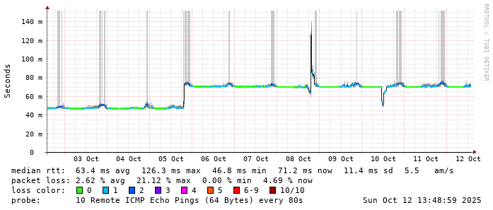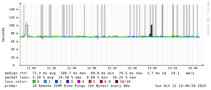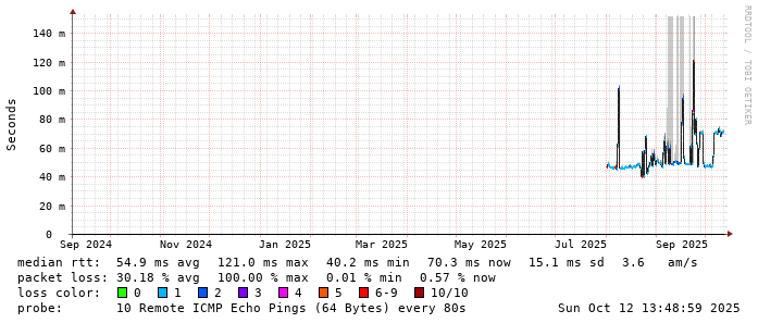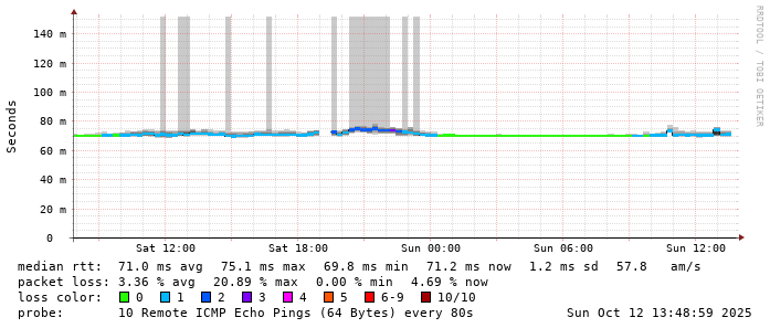 Start: 2025-10-12T05:02:38+0000HOST: ******** Loss% Snt Last Avg Best Wrst StDev 1. AS9678 103.98.75.193 0.0% 10 2.2 1.0 0.7 2.2 0.4 2. AS??? tw52.as9678.net 0.0% 10 1.1 1.2 1.0 1.8 0.2 3. AS??? ??? 100.0 10 0.0 0.0 0.0 0.0 0.0 4. AS3491 be41.clbr02.hkg04.as3491.net 80.0% 10 28.5 28.7 28.5 28.8 0.2 5. AS3491 63-218-115-254.static.as3491.net 0.0% 10 28.6 28.8 28.4 29.5 0.4 6. AS??? ??? 100.0 10 0.0 0.0 0.0 0.0 0.0 7. AS17639 161.49.6.147.convergeict.com 0.0% 10 73.1 67.3 66.0 73.1 2.1 8. AS62 198.32.172.69 0.0% 10 59.8 60.8 59.6 68.1 2.6 9. AS??? ??? 100.0 10 0.0 0.0 0.0 0.0 0.0 10. AS23944 130.105.0.125 10.0% 10 66.6 67.4 66.3 70.2 1.5 11. AS??? ??? 100.0 10 0.0 0.0 0.0 0.0 0.0 12. AS23944 111.68.32.1 10.0% 10 71.3 71.0 69.9 72.1 0.7
