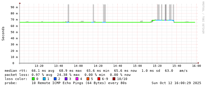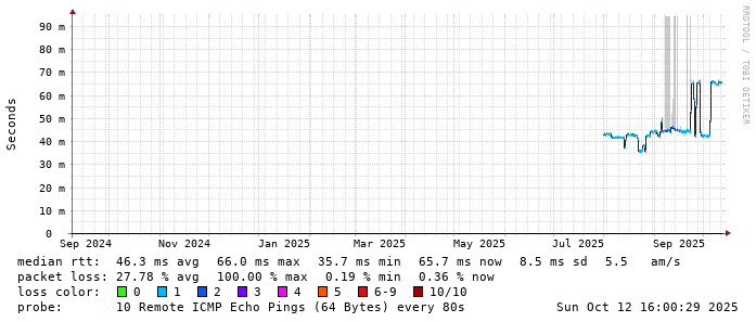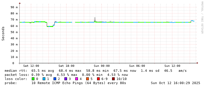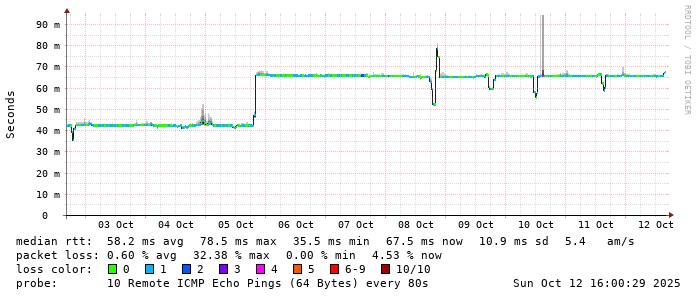 Start: 2025-10-12T05:03:15+0000HOST: ******** Loss% Snt Last Avg Best Wrst StDev 1. AS9678 103.98.75.193 0.0% 10 0.7 1.0 0.7 1.8 0.3 2. AS??? tw52.as9678.net 0.0% 10 1.1 1.1 1.0 1.2 0.1 3. AS??? ??? 100.0 10 0.0 0.0 0.0 0.0 0.0 4. AS??? ??? 100.0 10 0.0 0.0 0.0 0.0 0.0 5. AS3491 63-218-115-254.static.as3491.net 0.0% 10 28.5 28.5 28.4 28.7 0.1 6. AS??? ??? 100.0 10 0.0 0.0 0.0 0.0 0.0 7. AS??? ??? 100.0 10 0.0 0.0 0.0 0.0 0.0 8. AS17639 161.49.13.187.convergeict.com 0.0% 10 66.3 66.4 66.2 66.7 0.2 9. AS23944 gateway.skybroadband.com.ph 0.0% 10 65.7 65.8 65.7 65.8 0.0