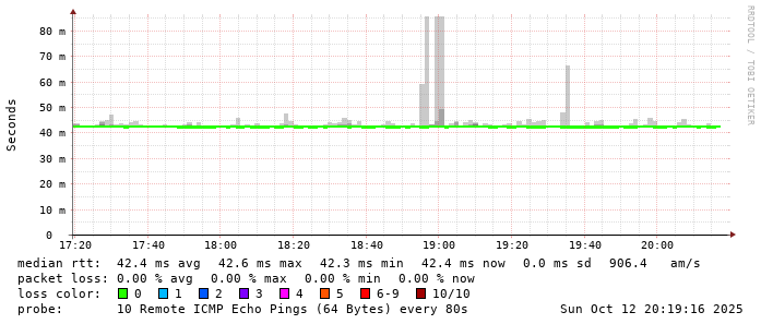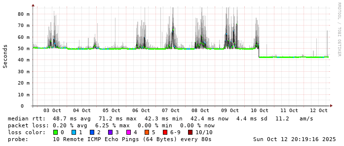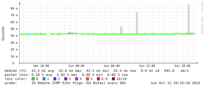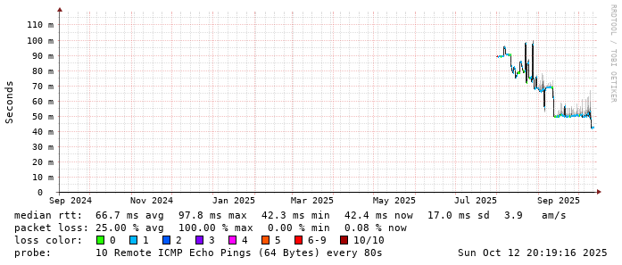 Start: 2025-10-12T05:03:50+0000HOST: ******** Loss% Snt Last Avg Best Wrst StDev 1. AS9678 103.98.75.193 0.0% 10 0.8 0.9 0.7 1.5 0.2 2. AS??? tw52.as9678.net 0.0% 10 1.2 1.1 1.0 1.5 0.2 3. AS??? ??? 100.0 10 0.0 0.0 0.0 0.0 0.0 4. AS3491 be41.clbr02.hkg04.as3491.net 50.0% 10 28.0 28.0 28.0 28.1 0.1 5. AS3491 source-telecom.te0-0-0-32-3.clbr02.hkg04.as3491.net 70.0% 10 42.3 42.4 42.3 42.5 0.1 6. AS18187 203.82.32.40 0.0% 10 42.4 42.5 42.4 42.6 0.1