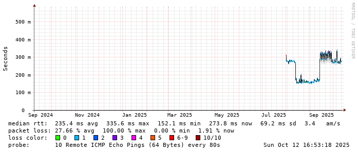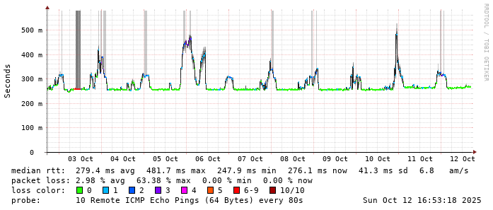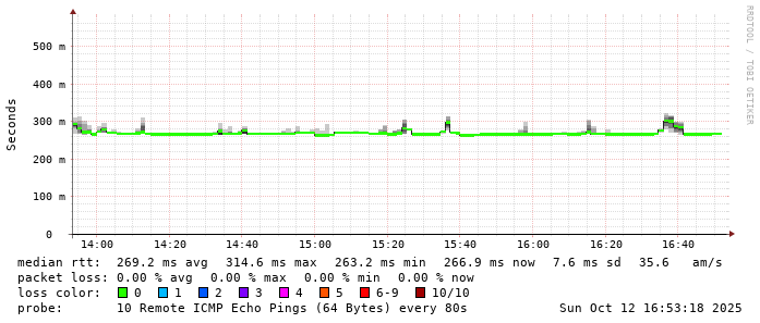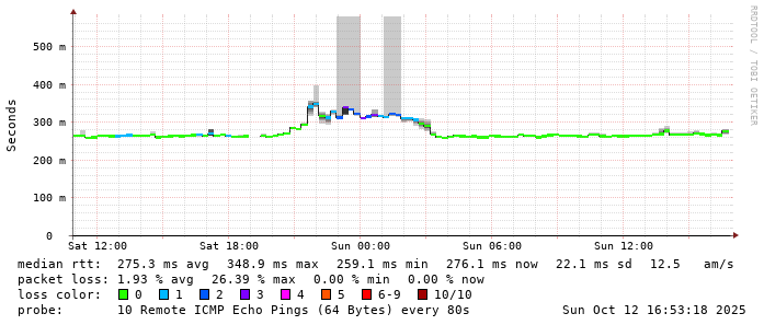 Start: 2025-10-12T05:04:42+0000HOST: ******** Loss% Snt Last Avg Best Wrst StDev 1. AS9678 103.98.75.193 0.0% 10 0.8 1.0 0.7 2.1 0.5 2. AS??? ??? 100.0 10 0.0 0.0 0.0 0.0 0.0 3. AS2914 ae-1.r25.taiptw01.tw.bb.gin.ntt.net 0.0% 10 0.5 1.0 0.5 2.9 0.7 4. AS2914 ae-10.r28.tkokhk01.hk.bb.gin.ntt.net 0.0% 10 28.0 27.6 27.5 28.0 0.2 5. AS2914 ae-3.r29.tkokhk01.hk.bb.gin.ntt.net 0.0% 10 20.8 20.7 20.4 21.3 0.3 6. AS2914 ae-6.r24.sngpsi07.sg.bb.gin.ntt.net 50.0% 10 64.5 64.6 64.5 64.7 0.1 7. AS2914 ae-15.a03.sngpsi07.sg.bb.gin.ntt.net 0.0% 10 71.5 71.6 71.5 72.1 0.2 8. AS2914 xe-3-5-3-0.a03.sngpsi07.sg.ce.gin.ntt.net 0.0% 10 266.7 266.7 266.6 267.6 0.3 9. AS??? ??? 100.0 10 0.0 0.0 0.0 0.0 0.0 10. AS9557 g5-0-0.khi77d2.pie.net.pk 0.0% 10 266.7 266.7 266.5 267.1 0.2