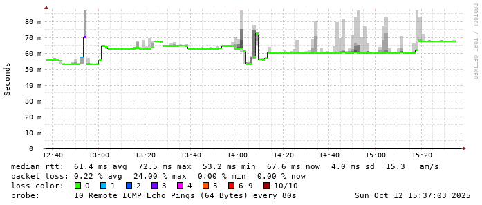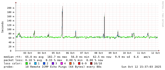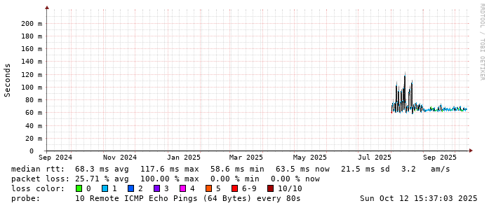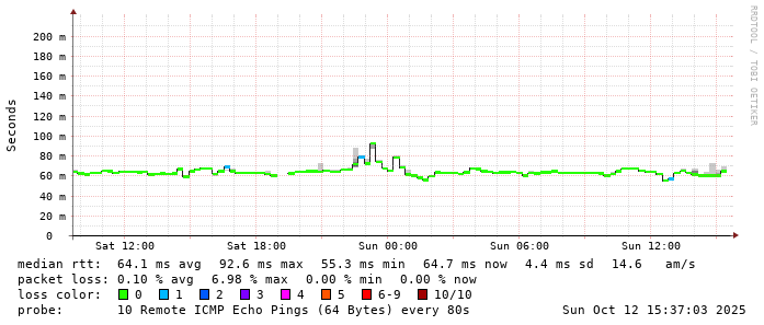 Start: 2025-10-12T05:06:12+0000HOST: ******** Loss% Snt Last Avg Best Wrst StDev 1. AS9678 103.98.75.193 0.0% 10 1.0 1.0 0.7 2.2 0.5 2. AS??? ??? 100.0 10 0.0 0.0 0.0 0.0 0.0 3. AS2914 ae-1.r25.taiptw01.tw.bb.gin.ntt.net 0.0% 10 0.4 0.6 0.4 1.1 0.2 4. AS2914 ae-10.r28.tkokhk01.hk.bb.gin.ntt.net 0.0% 10 27.5 27.6 27.5 28.4 0.3 5. AS2914 ae-3.r29.tkokhk01.hk.bb.gin.ntt.net 0.0% 10 20.4 20.6 20.3 20.9 0.2 6. AS2914 ae-6.r24.sngpsi07.sg.bb.gin.ntt.net 20.0% 10 60.1 59.9 59.8 60.1 0.1 7. AS2914 ae-0.a01.sngpsi08.sg.bb.gin.ntt.net 0.0% 10 56.9 58.5 55.3 67.3 4.5 8. AS141995 gw.contabo.net 0.0% 10 62.9 62.9 62.8 63.1 0.1