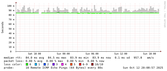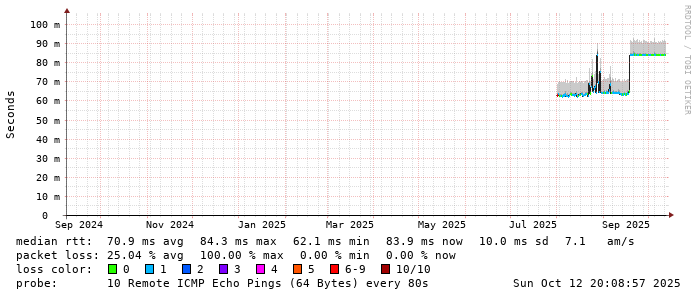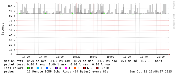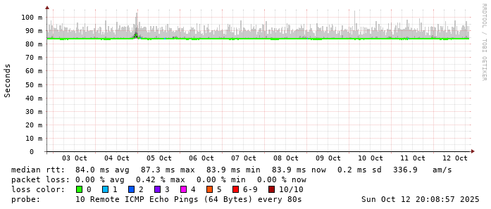 Start: 2025-10-12T05:07:02+0000HOST: ******** Loss% Snt Last Avg Best Wrst StDev 1. AS9678 103.98.75.193 0.0% 10 0.8 0.8 0.7 1.1 0.1 2. AS??? tw52.as9678.net 0.0% 10 1.0 1.2 1.0 1.9 0.3 3. AS??? ??? 100.0 10 0.0 0.0 0.0 0.0 0.0 4. AS??? ??? 100.0 10 0.0 0.0 0.0 0.0 0.0 5. AS3491 M1Net.BE5.214.br05.sin03.as3491.net 0.0% 10 83.7 83.5 83.3 83.9 0.2 6. AS17547 ae34-a84-roc.m1net.com.sg 0.0% 10 83.2 83.3 83.2 83.4 0.1 7. AS17547 145.31.126.129.static.m1net.com.sg 0.0% 10 83.5 83.6 83.4 83.9 0.1 8. AS17547 203.211.156.6 0.0% 10 84.3 84.5 84.2 84.9 0.2 9. AS17547 169.203-211-152.static.qala.com.sg 0.0% 10 84.1 84.2 83.8 86.6 0.9 10. AS17547 secdns.m1net.com.sg 0.0% 10 84.0 84.0 83.9 84.6 0.2