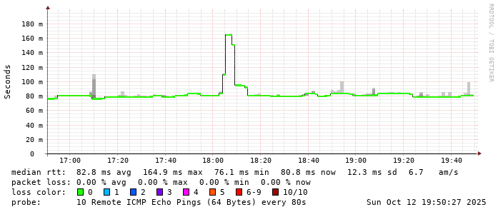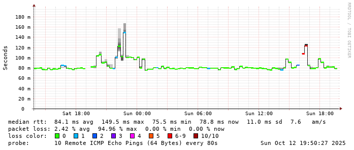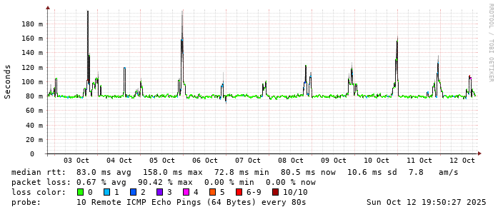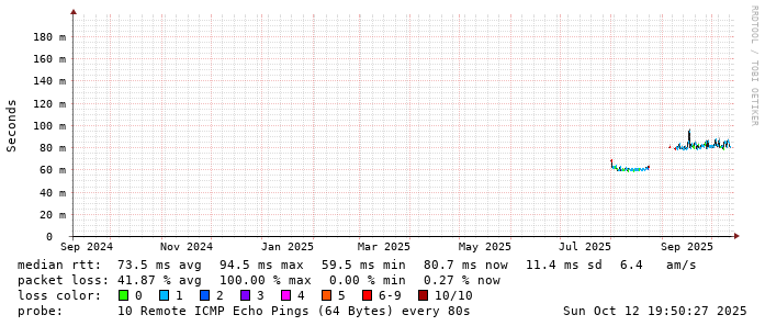 Start: 2025-10-12T05:07:40+0000HOST: ******** Loss% Snt Last Avg Best Wrst StDev 1. AS9678 103.98.75.193 0.0% 10 0.8 0.8 0.6 0.9 0.1 2. AS??? ??? 100.0 10 0.0 0.0 0.0 0.0 0.0 3. AS2914 ae-1.r25.taiptw01.tw.bb.gin.ntt.net 0.0% 10 0.6 0.6 0.5 1.1 0.2 4. AS2914 ae-10.r28.tkokhk01.hk.bb.gin.ntt.net 0.0% 10 20.6 20.5 20.4 20.7 0.1 5. AS2914 ae-3.r29.tkokhk01.hk.bb.gin.ntt.net 0.0% 10 20.8 20.7 20.3 21.1 0.2 6. AS2914 ae-6.r24.sngpsi07.sg.bb.gin.ntt.net 30.0% 10 57.5 57.4 57.2 57.5 0.1 7. AS2914 ae-4.a02.sngpsi07.sg.bb.gin.ntt.net 0.0% 10 59.6 59.6 59.5 59.7 0.1 8. AS2914 116.51.18.138 0.0% 10 77.1 79.8 77.1 102.9 8.1 9. AS4657 203.116.3-78.unknown.starhub.net.sg 0.0% 10 77.4 77.3 77.1 77.4 0.1 10. AS4657 203.117.162-250.unknown.starhub.net.sg 0.0% 10 78.4 77.6 76.2 82.8 2.2 11. AS4628 ephe-v3-SG1-148-211.pacificinternet.com 0.0% 10 76.2 79.1 76.1 94.3 6.3 12. AS4628 dns1.pacific.net.sg 0.0% 10 76.1 76.2 76.0 76.3 0.1