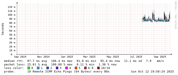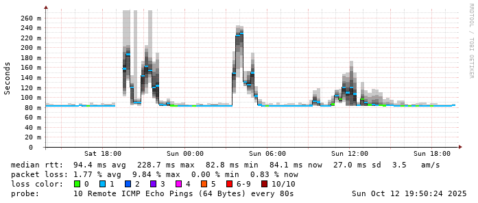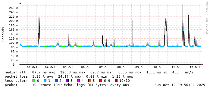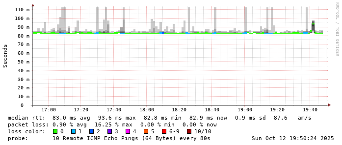 Start: 2025-10-12T05:09:07+0000HOST: ******** Loss% Snt Last Avg Best Wrst StDev 1. AS9678 103.98.75.193 0.0% 10 0.8 0.8 0.6 1.2 0.2 2. AS??? ??? 100.0 10 0.0 0.0 0.0 0.0 0.0 3. AS2914 ae-1.r25.taiptw01.tw.bb.gin.ntt.net 0.0% 10 0.6 0.7 0.5 1.3 0.3 4. AS2914 ae-4.a01.taiptw01.tw.bb.gin.ntt.net 90.0% 10 0.3 0.3 0.3 0.3 0.0 5. AS6453 ix-ae-29-0.tcore1.tj5-taipei.as6453.net 0.0% 10 0.6 0.6 0.5 0.8 0.1 6. AS6453 if-bundle-61-2.qcore2.tv2-tokyo.as6453.net 60.0% 10 81.8 84.3 81.1 90.4 4.2 7. AS6453 if-bundle-16-2.qcore1.tv2-tokyo.as6453.net 60.0% 10 81.0 81.5 80.9 82.9 1.0 8. AS6453 if-be-53-2.ecore1.svq-singapore.as6453.net 40.0% 10 81.4 83.6 81.3 89.2 3.2 9. AS3758 165.21.139.122 0.0% 10 91.6 93.0 81.4 170.7 27.7 10. AS3758 165.21.139.138 0.0% 10 85.4 83.3 80.4 88.1 2.5 11. AS3758 165.21.193.66 0.0% 10 82.4 83.7 81.9 90.7 3.2 12. AS3758 42.61.94.61 0.0% 10 83.2 86.1 83.0 92.7 3.6