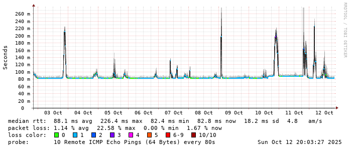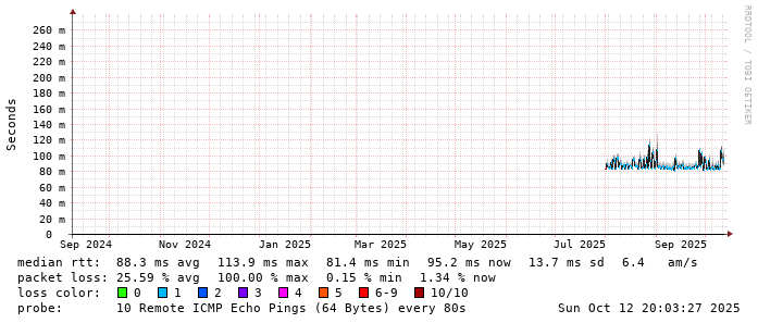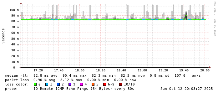 Start: 2025-10-12T05:07:57+0000HOST: ******** Loss% Snt Last Avg Best Wrst StDev 1. AS9678 103.98.75.193 0.0% 10 0.8 0.9 0.7 1.2 0.1 2. AS??? ??? 100.0 10 0.0 0.0 0.0 0.0 0.0 3. AS2914 ae-1.r25.taiptw01.tw.bb.gin.ntt.net 0.0% 10 3.5 1.2 0.5 3.5 1.1 4. AS2914 ae-4.a01.taiptw01.tw.bb.gin.ntt.net 90.0% 10 0.3 0.3 0.3 0.3 0.0 5. AS6453 ix-ae-29-0.tcore1.tj5-taipei.as6453.net 0.0% 10 0.5 1.0 0.5 3.0 0.8 6. AS6453 if-bundle-61-2.qcore2.tv2-tokyo.as6453.net 60.0% 10 90.8 91.7 83.9 100.3 6.7 7. AS6453 if-bundle-16-2.qcore1.tv2-tokyo.as6453.net 50.0% 10 91.8 92.4 80.9 102.7 9.9 8. AS6453 if-be-53-2.ecore1.svq-singapore.as6453.net 20.0% 10 86.8 87.2 81.5 98.9 6.7 9. AS3758 165.21.139.122 0.0% 10 98.3 89.0 81.4 105.3 8.2 10. AS3758 165.21.139.138 0.0% 10 103.1 85.0 80.2 103.1 7.4 11. AS3758 hs0130.singnet.com.sg 0.0% 10 100.4 89.5 81.3 102.4 7.6 12. AS3758 42.61.0.21 0.0% 10 91.7 90.0 82.4 100.2 6.6