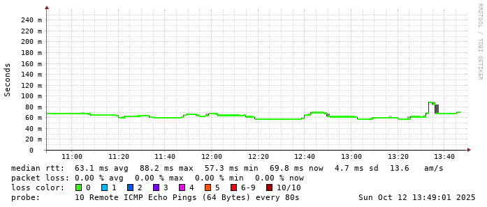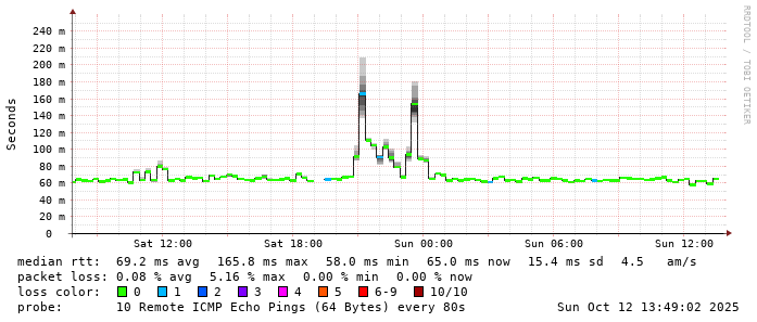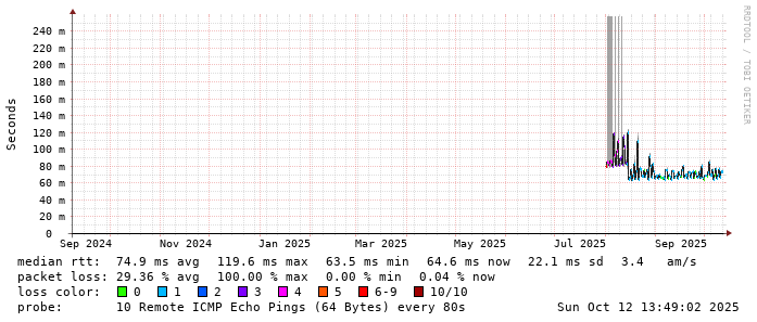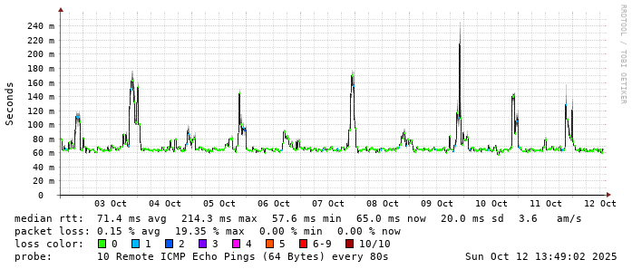 Start: 2025-10-12T05:09:44+0000HOST: ******** Loss% Snt Last Avg Best Wrst StDev 1. AS9678 103.98.75.193 0.0% 10 0.9 0.9 0.6 1.2 0.2 2. AS??? ??? 100.0 10 0.0 0.0 0.0 0.0 0.0 3. AS2914 ae-1.r25.taiptw01.tw.bb.gin.ntt.net 0.0% 10 0.4 0.8 0.4 1.1 0.3 4. AS2914 ae-10.r28.tkokhk01.hk.bb.gin.ntt.net 10.0% 10 20.5 20.9 20.5 22.2 0.5 5. AS2914 ae-3.r29.tkokhk01.hk.bb.gin.ntt.net 0.0% 10 20.4 21.1 20.4 26.1 1.7 6. AS2914 ae-6.r24.sngpsi07.sg.bb.gin.ntt.net 20.0% 10 57.5 57.3 57.2 57.5 0.1 7. AS2914 ae-15.a03.sngpsi07.sg.bb.gin.ntt.net 0.0% 10 64.2 64.3 64.2 64.5 0.1 8. AS2914 ae-0.telin.sngpsi07.sg.bb.gin.ntt.net 0.0% 10 64.4 59.8 57.4 64.4 3.1 9. AS56308 228.168.22.103.in-addr.arpa 0.0% 10 60.0 60.1 60.0 60.4 0.1 10. AS56308 pridns.telin.sg 0.0% 10 57.5 57.5 57.4 57.6 0.1