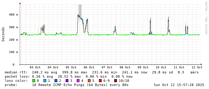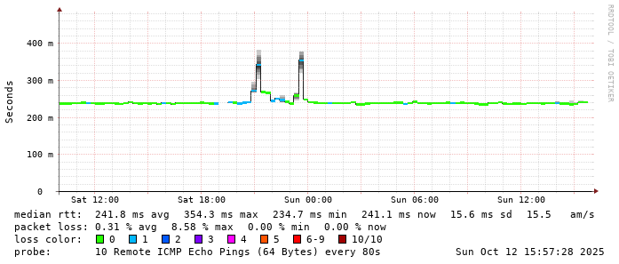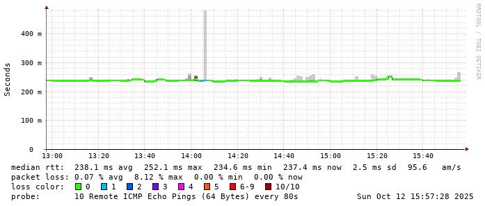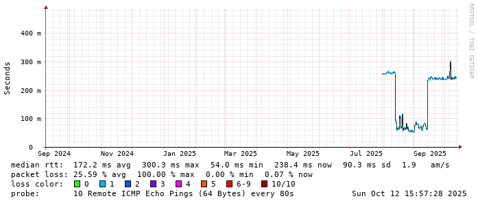 Start: 2025-10-12T05:10:01+0000HOST: ******** Loss% Snt Last Avg Best Wrst StDev 1. AS9678 103.98.75.193 0.0% 10 0.8 1.0 0.7 2.7 0.6 2. AS??? ??? 100.0 10 0.0 0.0 0.0 0.0 0.0 3. AS2914 ae-1.r25.taiptw01.tw.bb.gin.ntt.net 0.0% 10 0.4 0.6 0.4 1.1 0.2 4. AS2914 ae-10.r28.tkokhk01.hk.bb.gin.ntt.net 10.0% 10 20.4 20.6 20.3 22.0 0.5 5. AS2914 ae-3.r29.tkokhk01.hk.bb.gin.ntt.net 0.0% 10 20.4 20.5 20.4 20.6 0.1 6. AS2914 ae-6.r24.sngpsi07.sg.bb.gin.ntt.net 40.0% 10 59.9 59.9 59.8 60.1 0.1 7. AS2914 ae-15.a03.sngpsi07.sg.bb.gin.ntt.net 0.0% 10 66.8 66.9 66.8 66.9 0.1 8. AS2914 ce-0-2-1-1.a03.sngpsi07.sg.ce.gin.ntt.net 0.0% 10 237.2 237.9 237.0 244.6 2.3 9. AS18106 132.147.112.106 0.0% 10 240.0 238.2 237.4 240.1 1.1 10. AS18106 donald.vqbn.com 0.0% 10 237.6 237.4 237.4 237.6 0.1