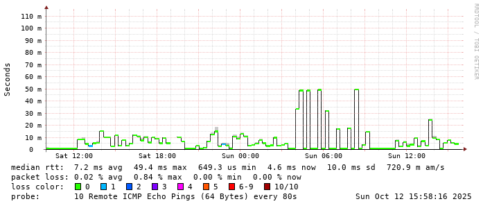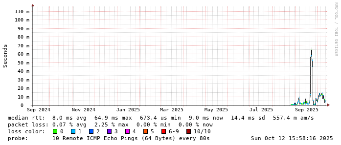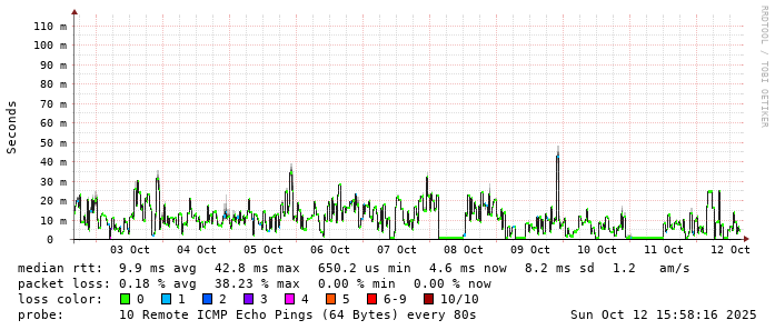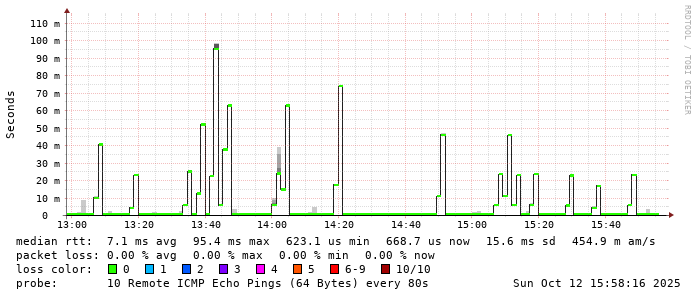 Start: 2025-10-12T05:11:58+0000HOST: ******** Loss% Snt Last Avg Best Wrst StDev 1. AS9678 2401:95c0:2ff:ff91:: 0.0% 10 1.0 1.2 0.9 1.9 0.3 2. AS??? 2401:95c0:ffff:ffff:103:98:72:5 0.0% 10 1.2 1.4 1.2 1.9 0.2 3. AS??? 2620:107:4000:3210::f006:3c00 0.0% 10 0.4 0.5 0.4 1.4 0.3 4. AS??? 2620:107:4000:3050::f006:200c 0.0% 10 1.1 1.1 1.0 1.4 0.1 5. AS??? 2620:107:4000:3050::f006:2017 0.0% 10 0.9 0.9 0.8 0.9 0.0 6. AS??? 2620:107:4000:cfff::f212:cbfd 0.0% 10 1.0 1.0 0.9 1.1 0.1 7. AS??? ??? 100.0 10 0.0 0.0 0.0 0.0 0.0 8. AS??? ??? 100.0 10 0.0 0.0 0.0 0.0 0.0 9. AS16509 2600:9000:2831:5000:7:b49:9c0:93a1 0.0% 10 0.7 0.8 0.7 0.9 0.1