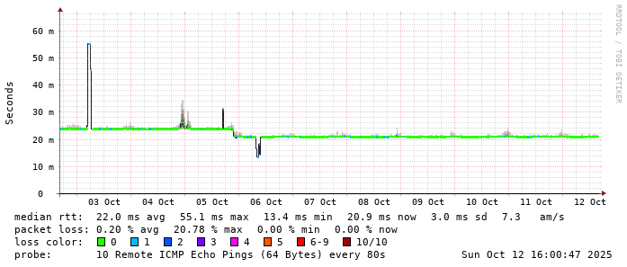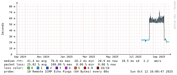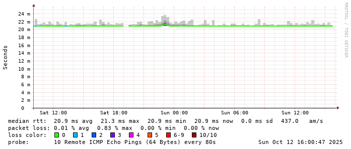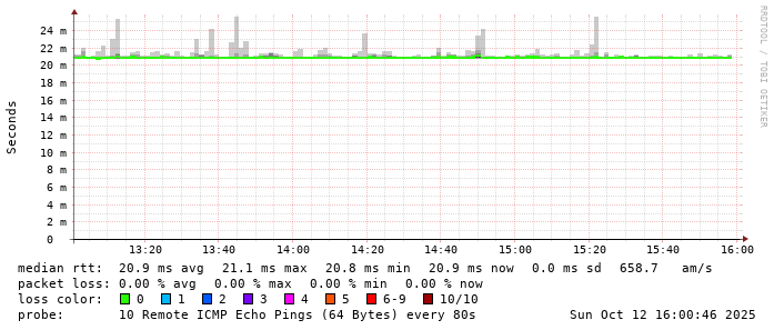 Start: 2025-10-12T05:12:55+0000HOST: ******** Loss% Snt Last Avg Best Wrst StDev 1. AS9678 103.98.75.193 0.0% 10 0.9 1.1 0.7 2.2 0.5 2. AS??? ??? 100.0 10 0.0 0.0 0.0 0.0 0.0 3. AS2914 199.245.24.195 0.0% 10 13.8 13.8 13.6 14.4 0.3 4. AS4780 h2-192-72-107.seed.net.tw 0.0% 10 21.0 21.0 20.9 21.1 0.1