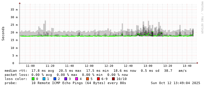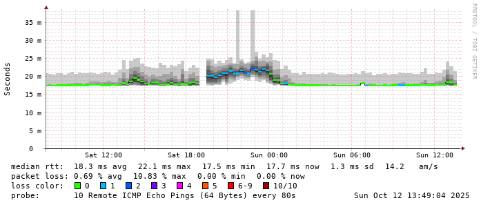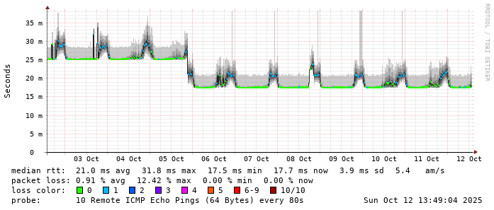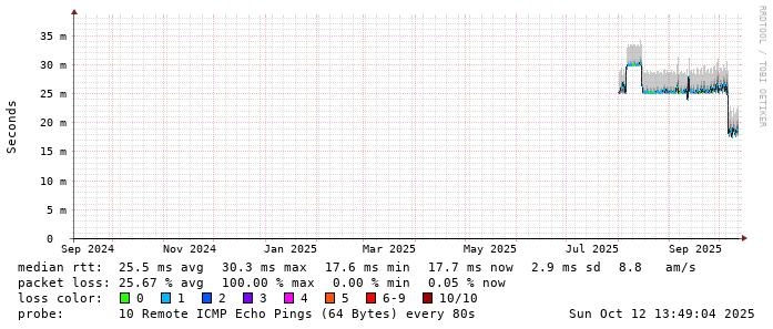 Start: 2025-10-12T05:14:01+0000HOST: ******** Loss% Snt Last Avg Best Wrst StDev 1. AS9678 103.98.75.193 0.0% 10 0.8 0.8 0.7 0.9 0.0 2. AS??? tw52.as9678.net 0.0% 10 1.0 1.3 1.0 3.4 0.8 3. AS??? 11-223-163-203-static.tpix.net.tw 0.0% 10 24.4 24.5 24.3 24.9 0.2 4. AS9416 TPNOC1-P68-PO64-CHIEF.IX.kbtelecom.net 30.0% 10 32.6 29.7 28.8 32.6 1.4 5. AS9416 host-203-133-26-45.ip.kbtelecom.net 0.0% 10 31.9 28.3 25.4 36.3 3.3 6. AS9416 host-203-133-26-102.ip.kbtelecom.net 0.0% 10 38.9 30.4 26.1 38.9 4.4 7. AS9416 host-203-133-26-190.ip.kbtelecom.net 0.0% 10 27.8 28.2 24.1 35.9 4.3 8. AS9416 KEELUNG-AR93-1-PO301-BR93-1.IX.kbtelecom.net 0.0% 10 25.6 28.0 25.1 36.0 3.8 9. AS??? ??? 100.0 10 0.0 0.0 0.0 0.0 0.0 10. AS9416 host-219-71-130-60.dynamic.kbtelecom.net 0.0% 10 34.3 28.6 24.1 34.7 4.7 11. AS9416 host-219-71-130-1.dynamic.kbtelecom.net 0.0% 10 26.3 22.4 19.1 28.0 3.1