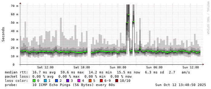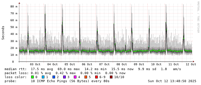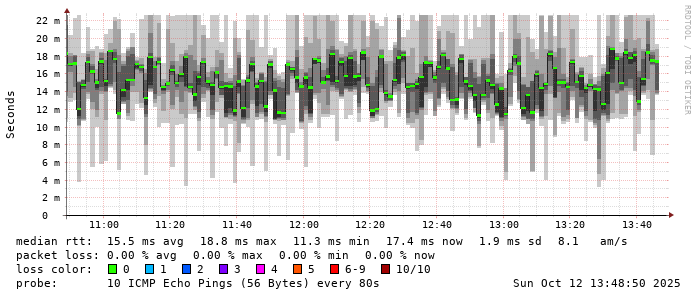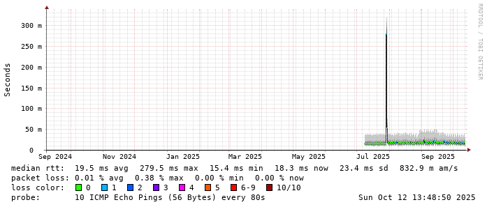 Start: 2025-10-12T05:15:02+0000HOST: ******** Loss% Snt Last Avg Best Wrst StDev 1. AS9678 103.98.75.193 0.0% 10 0.7 0.9 0.7 2.0 0.4 2. AS??? tw81.as9678.net 0.0% 10 1.1 1.0 0.9 1.1 0.1 3. AS??? ??? 100.0 10 0.0 0.0 0.0 0.0 0.0 4. AS??? 220-128-1-126.tpdt-3032.hinet.net 0.0% 10 1.8 2.0 1.8 2.4 0.2 5. AS??? ??? 100.0 10 0.0 0.0 0.0 0.0 0.0 6. AS??? 220-128-9-253.hinet-ip.hinet.net 0.0% 10 2.4 2.5 2.2 2.7 0.2 7. AS??? 220-128-9-21.tylc-3336.hinet.net 10.0% 10 1.9 2.0 1.7 2.3 0.2 8. AS3462 210-71-143-49.hinet-ip.hinet.net 0.0% 10 1.6 2.9 1.6 13.1 3.6 9. AS24506 lsn4.tp2.yahoo.com 0.0% 10 10.3 13.9 10.3 17.6 2.5