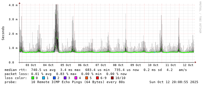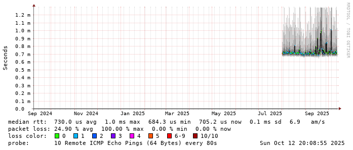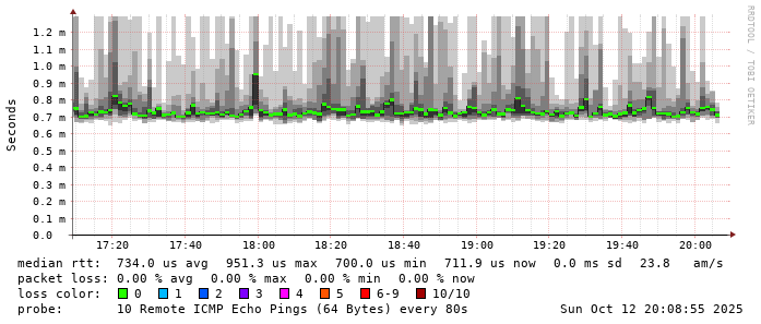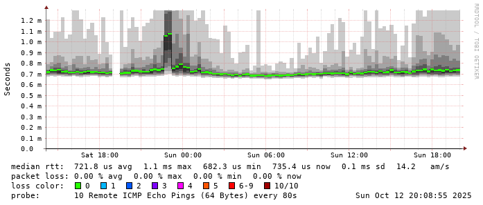 Start: 2025-10-12T05:15:35+0000HOST: ******** Loss% Snt Last Avg Best Wrst StDev 1. AS9678 103.98.75.193 0.0% 10 0.8 0.8 0.6 0.9 0.1 2. AS??? ??? 100.0 10 0.0 0.0 0.0 0.0 0.0 3. AS15169 172.253.50.121 0.0% 10 2.1 1.0 0.8 2.1 0.4 4. AS15169 142.251.77.87 0.0% 10 0.8 0.9 0.8 1.4 0.2 5. AS15169 dns.google 0.0% 10 0.7 0.7 0.7 0.7 0.0