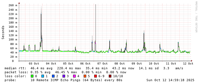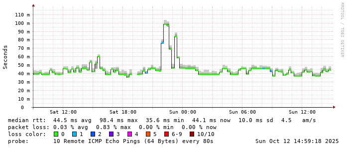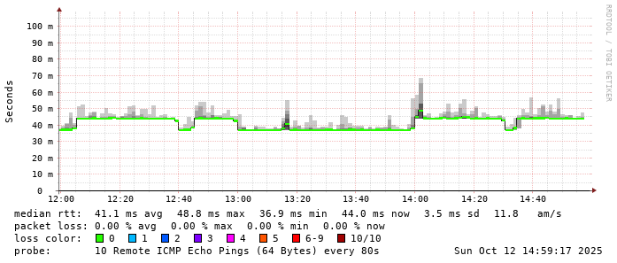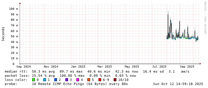 Start: 2025-10-12T05:15:51+0000HOST: ******** Loss% Snt Last Avg Best Wrst StDev 1. AS9678 103.98.75.193 0.0% 10 0.7 1.0 0.7 3.1 0.7 2. AS??? ??? 100.0 10 0.0 0.0 0.0 0.0 0.0 3. AS2914 ae-1.r25.taiptw01.tw.bb.gin.ntt.net 0.0% 10 0.7 0.9 0.5 1.7 0.3 4. AS2914 ae-10.r28.tkokhk01.hk.bb.gin.ntt.net 0.0% 10 27.9 27.8 27.6 28.2 0.2 5. AS2914 ae-18.a00.chwahk03.hk.bb.gin.ntt.net 0.0% 10 27.1 22.6 20.7 27.1 2.3 6. AS2914 xe-1-5-2-3.a00.chwahk03.hk.ce.gin.ntt.net 0.0% 10 21.3 21.3 21.2 21.4 0.1 7. AS45896 103.37.31.78 0.0% 10 36.8 36.9 36.7 37.5 0.2 8. AS45896 111.91.235.17 0.0% 10 37.2 37.2 37.1 37.4 0.1 9. AS45896 103.37.31.102 0.0% 10 36.7 55.7 36.7 215.3 56.2 10. AS45896 103.37.29.26 0.0% 10 36.8 37.0 36.8 37.4 0.2 11. AS38726 119.18.185.25 0.0% 10 36.9 37.3 36.9 39.7 0.8