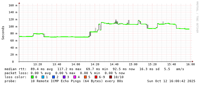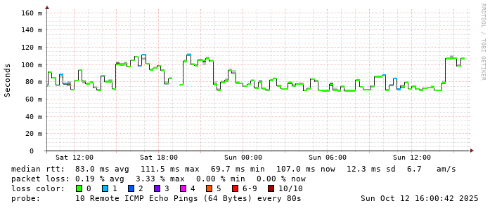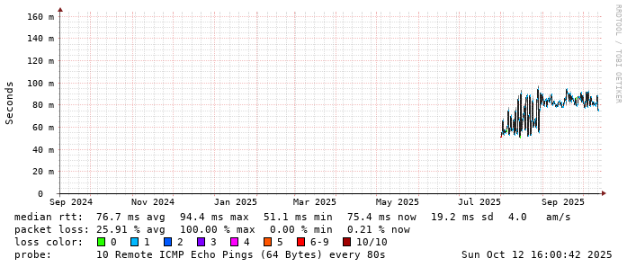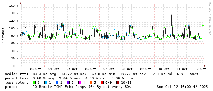 Start: 2025-10-12T05:17:03+0000HOST: ******** Loss% Snt Last Avg Best Wrst StDev 1. AS9678 103.98.75.193 0.0% 10 0.9 1.0 0.7 2.1 0.4 2. AS??? tw52.as9678.net 0.0% 10 1.3 1.1 1.0 1.6 0.2 3. AS??? ??? 100.0 10 0.0 0.0 0.0 0.0 0.0 4. AS??? ??? 100.0 10 0.0 0.0 0.0 0.0 0.0 5. AS??? ??? 100.0 10 0.0 0.0 0.0 0.0 0.0 6. AS7552 localhost 20.0% 10 92.4 92.6 92.0 93.4 0.6 7. AS7552 localhost 0.0% 10 78.9 79.0 78.9 79.1 0.1 8. AS7552 dns1.vietel.com.vn 0.0% 10 79.6 79.8 79.5 80.4 0.3