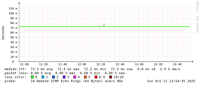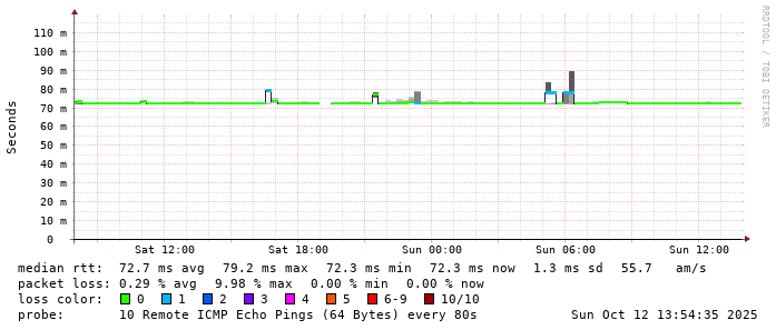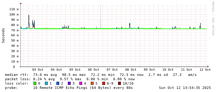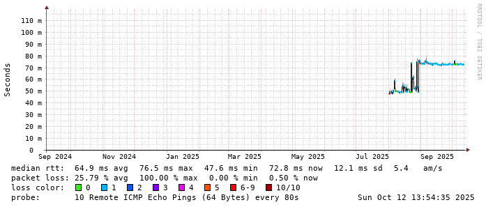 Start: 2025-10-12T05:17:19+0000HOST: ******** Loss% Snt Last Avg Best Wrst StDev 1. AS9678 103.98.75.193 0.0% 10 0.8 0.8 0.7 1.0 0.1 2. AS??? tw52.as9678.net 0.0% 10 1.3 2.2 1.0 11.3 3.2 3. AS??? ??? 100.0 10 0.0 0.0 0.0 0.0 0.0 4. AS3491 Viettel-Business-Solutions-Corporation-Branch-of-Viettel-Group.Bundle-Ether30.br 0.0% 10 56.1 56.2 56.0 56.4 0.1 5. AS7552 localhost 0.0% 10 77.2 76.2 72.0 80.3 2.7 6. AS??? ??? 100.0 10 0.0 0.0 0.0 0.0 0.0 7. AS7552 dynamic-ip-adsl.viettel.vn 0.0% 10 97.6 97.6 97.3 97.9 0.2 8. AS23902 203.119.72.17 0.0% 10 72.4 72.4 72.3 72.5 0.1