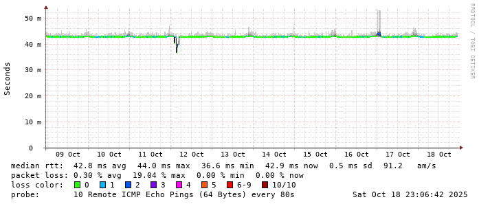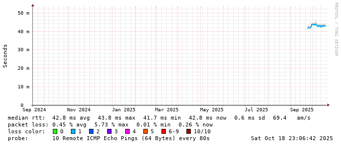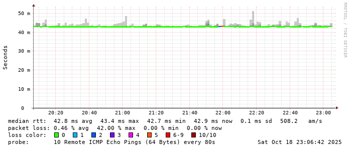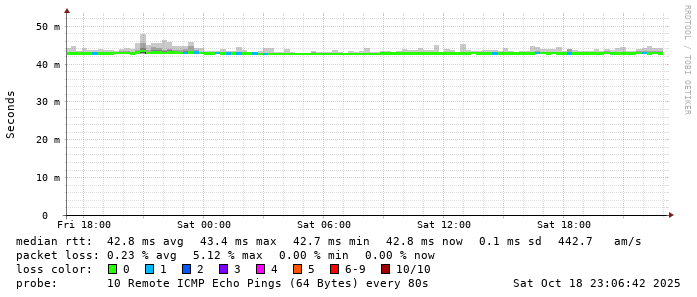 Start: 2025-10-18T12:10:13+0800HOST: ********* Loss% Snt Last Avg Best Wrst StDev 1. AS??? 100.74.0.1 0.0% 10 2.5 2.9 2.3 4.1 0.7 2. AS??? 10.229.4.29 0.0% 10 2.1 2.6 2.1 4.8 0.8 3. AS??? 10.229.5.12 0.0% 10 2.9 3.4 2.6 6.9 1.4 4. AS??? 10.229.5.30 0.0% 10 2.9 3.8 2.7 10.7 2.4 5. AS??? 10.192.3.216 0.0% 10 2.8 3.6 2.8 8.9 1.9 6. AS??? 10.192.3.66 30.0% 10 2.8 7.0 2.5 31.9 11.0 7. AS??? ??? 100.0 10 0.0 0.0 0.0 0.0 0.0 8. AS??? 10.192.3.33 30.0% 10 3.5 4.0 2.9 7.0 1.6 9. AS??? 10.192.3.9 0.0% 10 3.0 3.5 2.9 7.6 1.4 10. AS??? 10.219.253.20 0.0% 10 3.3 3.3 3.1 3.6 0.1 11. AS749 26.116.2.16 0.0% 10 4.1 4.4 3.6 8.2 1.4 12. AS133774 59.56.101.182 0.0% 10 2.4 2.9 2.4 6.3 1.2 13. AS133774 59.56.101.181 10.0% 10 5.4 5.4 4.8 5.7 0.3 14. AS133774 27.148.128.5 80.0% 10 7.3 7.9 7.3 8.5 0.8 15. AS??? ??? 100.0 10 0.0 0.0 0.0 0.0 0.0 16. AS??? ??? 100.0 10 0.0 0.0 0.0 0.0 0.0 17. AS4134 202.97.39.181 50.0% 10 20.6 20.6 20.5 20.9 0.1 18. AS4134 202.97.4.214 0.0% 10 41.5 41.5 41.4 41.7 0.1 19. AS9505 203-78-181-153.twgate-ip.twgate.net 0.0% 10 41.2 41.2 41.1 41.3 0.0 20. AS9505 175-41-58-146.twgate-ip.twgate.net 0.0% 10 42.3 43.1 42.2 50.0 2.4 21. AS9505 203-78-181-62.twgate-ip.twgate.net 0.0% 10 43.2 42.7 42.4 43.8 0.5 22. AS9678 103.150.36.200 0.0% 10 42.7 42.9 42.7 43.4 0.2