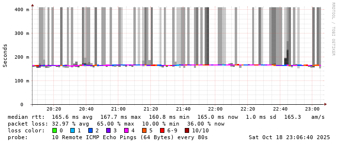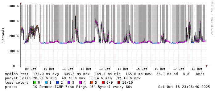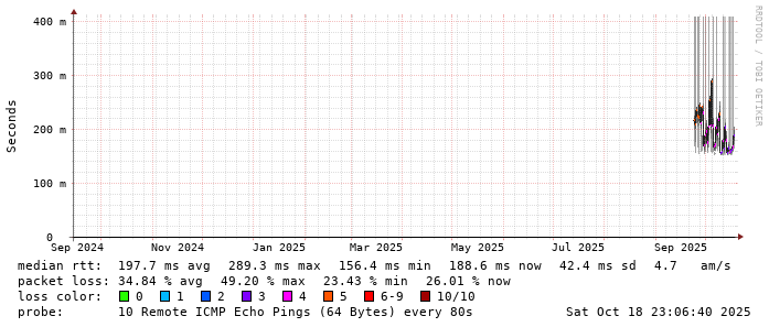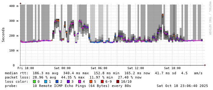 Start: 2025-10-18T12:11:48+0800HOST: ********* Loss% Snt Last Avg Best Wrst StDev 1. AS??? 100.74.0.1 0.0% 10 2.4 2.7 2.3 4.3 0.6 2. AS??? 10.229.4.29 0.0% 10 2.4 2.7 2.3 4.6 0.7 3. AS??? 10.229.5.4 0.0% 10 2.8 3.2 2.5 7.5 1.5 4. AS??? 10.229.5.20 0.0% 10 2.8 3.4 2.5 9.3 2.1 5. AS??? ??? 100.0 10 0.0 0.0 0.0 0.0 0.0 6. AS??? 10.192.3.66 70.0% 10 3.1 4.8 3.1 8.1 2.9 7. AS??? ??? 100.0 10 0.0 0.0 0.0 0.0 0.0 8. AS??? 10.192.3.33 70.0% 10 3.2 4.7 2.8 8.2 3.0 9. AS??? 10.192.3.9 20.0% 10 2.9 3.6 2.7 8.0 1.8 10. AS??? 10.219.253.14 0.0% 10 3.4 3.2 3.0 3.4 0.1 11. AS749 26.116.2.12 0.0% 10 3.7 3.8 3.6 4.1 0.2 12. AS133774 59.56.101.178 0.0% 10 2.5 3.2 2.2 9.9 2.4 13. AS133774 59.56.101.177 70.0% 10 2.9 2.8 2.7 2.9 0.1 14. AS133774 27.148.158.177 0.0% 10 5.3 4.1 3.4 6.3 1.0 15. AS4134 202.97.95.237 90.0% 10 16.6 16.6 16.6 16.6 0.0 16. AS4134 202.97.57.157 80.0% 10 16.2 17.3 16.2 18.3 1.4 17. AS4134 202.97.35.86 0.0% 10 19.9 19.8 19.6 19.9 0.1 18. AS??? 203.86.97.6 20.0% 10 133.1 124.9 113.5 151.5 12.7 19. AS2914 ae-3.r33.tokyjp05.jp.bb.gin.ntt.net 60.0% 10 129.8 132.7 123.9 149.1 11.2 20. AS2914 ae-4.r24.taiptw01.tw.bb.gin.ntt.net 0.0% 10 97.4 101.6 88.9 136.4 13.2 21. AS2914 ae-5.a00.taiptw01.tw.bb.gin.ntt.net 20.0% 10 140.2 149.2 140.2 190.1 16.8 22. AS2914 ae-19-805.a00.taiptw01.tw.ce.gin.ntt.net 30.0% 10 166.8 170.5 157.2 224.9 24.2 23. AS??? tw52.as9678.net 10.0% 10 153.5 158.2 145.5 210.5 20.5 24. AS9678 152-151-103-232.hostinginside.com 20.0% 10 166.6 161.0 155.0 167.0 4.3