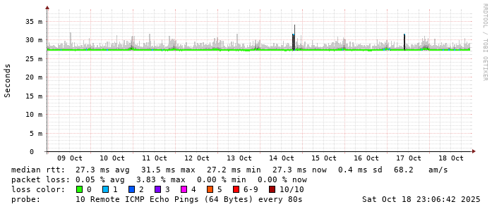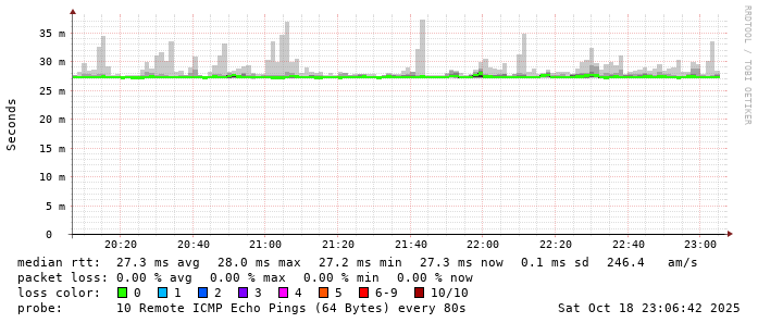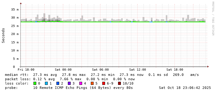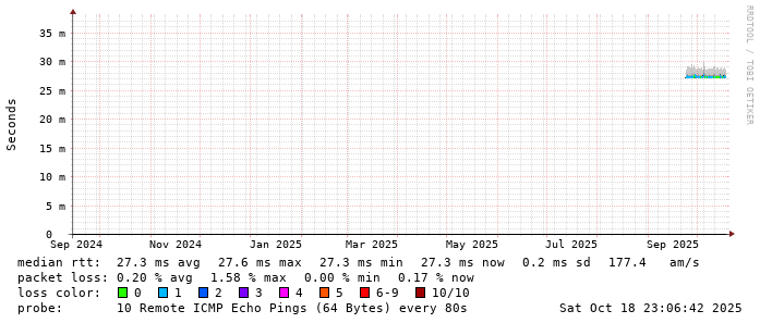 Start: 2025-10-18T12:26:02+0800HOST: ********* Loss% Snt Last Avg Best Wrst StDev 1. AS??? 100.92.0.1 0.0% 10 2.8 3.3 2.1 6.7 1.4 2. AS??? 10.231.241.52 0.0% 10 2.5 3.3 2.2 7.4 1.8 3. AS??? 10.231.241.9 0.0% 10 2.7 3.1 2.4 8.4 1.8 4. AS??? 10.238.192.14 0.0% 10 3.2 3.1 2.4 4.7 0.8 5. AS??? 10.238.192.4 0.0% 10 2.5 2.7 2.3 4.8 0.7 6. AS??? 10.190.226.137 10.0% 10 3.2 5.3 2.7 23.0 6.7 7. AS??? 10.190.3.66 0.0% 10 3.2 3.9 2.8 8.5 1.7 8. AS??? ??? 100.0 10 0.0 0.0 0.0 0.0 0.0 9. AS??? 10.190.3.33 90.0% 10 11.8 11.8 11.8 11.8 0.0 10. AS??? ??? 100.0 10 0.0 0.0 0.0 0.0 0.0 11. AS??? 10.190.3.5 0.0% 10 1.8 2.1 1.8 4.1 0.7 12. AS??? ??? 100.0 10 0.0 0.0 0.0 0.0 0.0 13. AS58461 220.187.247.120 0.0% 10 3.0 3.7 3.0 7.5 1.4 14. AS58461 220.191.199.137 70.0% 10 2.9 2.9 2.8 2.9 0.0 15. AS4134 202.97.101.213 70.0% 10 9.3 9.3 9.3 9.3 0.0 16. AS4134 202.97.57.25 90.0% 10 5.5 5.5 5.5 5.5 0.0 17. AS4134 202.97.12.186 80.0% 10 8.4 8.4 8.4 8.4 0.0 18. AS4134 202.97.4.210 0.0% 10 23.0 23.3 23.0 24.8 0.5 19. AS9505 203-78-181-153.twgate-ip.twgate.net 0.0% 10 25.4 25.4 25.3 26.0 0.2 20. AS9505 175-41-58-146.twgate-ip.twgate.net 0.0% 10 22.4 22.5 22.4 22.6 0.1 21. AS9505 203-78-181-62.twgate-ip.twgate.net 0.0% 10 25.0 24.8 24.5 25.5 0.3 22. AS9678 103.150.36.200 0.0% 10 27.3 27.3 27.1 27.4 0.1