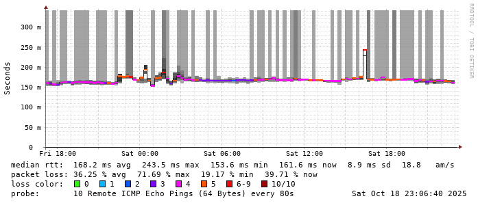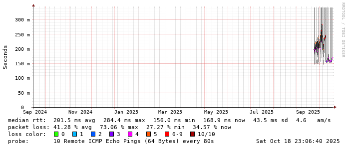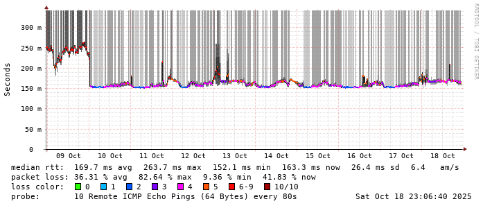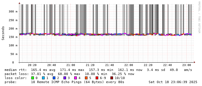 Start: 2025-10-18T12:27:30+0800HOST: ********* Loss% Snt Last Avg Best Wrst StDev 1. AS??? 100.92.0.1 0.0% 10 2.5 2.8 2.2 4.7 0.8 2. AS??? 10.231.241.52 0.0% 10 2.4 2.9 2.1 5.6 1.1 3. AS??? 10.231.241.9 0.0% 10 2.8 2.7 2.4 3.9 0.4 4. AS??? 10.238.192.14 0.0% 10 2.7 2.5 2.2 3.3 0.3 5. AS??? 10.238.192.4 0.0% 10 2.9 2.9 2.3 4.1 0.5 6. AS??? 10.190.226.137 70.0% 10 2.7 4.2 2.7 6.1 1.8 7. AS??? 10.190.3.66 50.0% 10 4.0 6.0 3.1 11.2 3.7 8. AS??? ??? 100.0 10 0.0 0.0 0.0 0.0 0.0 9. AS??? 10.190.3.33 50.0% 10 4.4 4.9 3.1 10.4 3.2 10. AS??? 10.190.3.9 70.0% 10 3.1 5.1 2.9 9.2 3.6 11. AS??? 10.190.3.1 0.0% 10 2.0 2.5 2.0 4.2 0.8 12. AS??? ??? 100.0 10 0.0 0.0 0.0 0.0 0.0 13. AS58461 220.187.247.114 0.0% 10 5.1 5.2 5.0 5.9 0.3 14. AS??? ??? 100.0 10 0.0 0.0 0.0 0.0 0.0 15. AS4134 202.97.33.241 40.0% 10 13.3 14.1 13.3 17.2 1.6 16. AS4134 202.97.51.6 90.0% 10 12.9 12.9 12.9 12.9 0.0 17. AS4134 202.97.39.177 90.0% 10 13.4 13.4 13.4 13.4 0.0 18. AS2914 xe-1-5-2-3.a03.tokyjp05.jp.bb.gin.ntt.net 10.0% 10 139.2 140.4 138.8 143.1 1.3 19. AS2914 ae-3.r33.tokyjp05.jp.bb.gin.ntt.net 90.0% 10 131.6 131.6 131.6 131.6 0.0 20. AS2914 ae-4.r24.taiptw01.tw.bb.gin.ntt.net 20.0% 10 117.8 118.4 115.8 122.3 2.2 21. AS2914 ae-5.a00.taiptw01.tw.bb.gin.ntt.net 50.0% 10 163.5 166.0 162.7 170.8 3.2 22. AS2914 ae-19-805.a00.taiptw01.tw.ce.gin.ntt.net 20.0% 10 150.5 151.6 149.1 154.4 1.7 23. AS??? tw52.as9678.net 40.0% 10 174.2 168.9 166.4 174.2 2.8 24. AS9678 152-151-103-232.hostinginside.com 20.0% 10 165.0 167.9 165.0 172.1 2.7