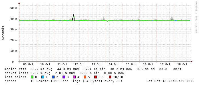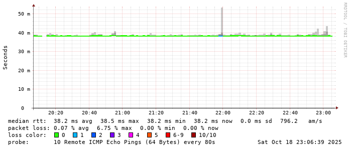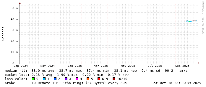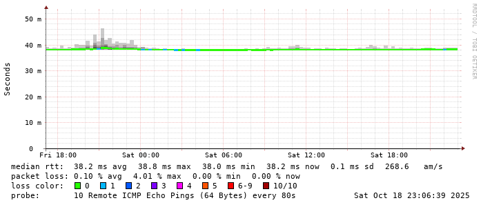 Start: 2025-10-18T12:12:47+0800HOST: ********* Loss% Snt Last Avg Best Wrst StDev 1. AS??? 100.78.0.1 0.0% 10 1.2 1.9 1.2 3.2 0.7 2. AS??? ??? 100.0 10 0.0 0.0 0.0 0.0 0.0 3. AS749 26.32.6.106 0.0% 10 3.0 3.1 2.1 8.8 2.0 4. AS749 26.32.6.81 10.0% 10 3.5 4.3 2.0 15.9 4.4 5. AS749 26.32.6.22 0.0% 10 1.7 2.3 1.5 6.8 1.6 6. AS??? ??? 100.0 10 0.0 0.0 0.0 0.0 0.0 7. AS749 26.32.32.1 0.0% 10 1.7 2.5 1.6 6.2 1.4 8. AS??? ??? 100.0 10 0.0 0.0 0.0 0.0 0.0 9. AS135089 14.22.22.58 0.0% 10 0.9 0.9 0.7 1.1 0.1 113.96.31.246 AS4134 113.96.31.246 10. AS4134 113.96.31.245 50.0% 10 3.2 3.9 2.5 6.9 1.8 11. AS4134 119.147.167.89 0.0% 10 1.3 1.4 1.3 1.8 0.2 12. AS4134 219.128.214.73 90.0% 10 1.8 1.8 1.8 1.8 0.0 13. AS4134 202.97.120.209 90.0% 10 27.8 27.8 27.8 27.8 0.0 14. AS??? ??? 100.0 10 0.0 0.0 0.0 0.0 0.0 15. AS4134 202.97.85.198 50.0% 10 25.3 30.2 25.3 44.0 8.1 16. AS4134 202.97.4.214 0.0% 10 37.9 38.2 37.8 41.1 1.0 17. AS9505 203-78-181-153.twgate-ip.twgate.net 0.0% 10 37.4 37.9 37.3 40.3 1.0 18. AS9505 175-41-58-146.twgate-ip.twgate.net 0.0% 10 37.7 43.5 37.7 85.0 14.9 19. AS9505 203-78-181-62.twgate-ip.twgate.net 0.0% 10 37.7 37.8 37.7 38.0 0.1 20. AS9678 103.150.36.200 0.0% 10 38.0 38.2 38.0 38.3 0.1