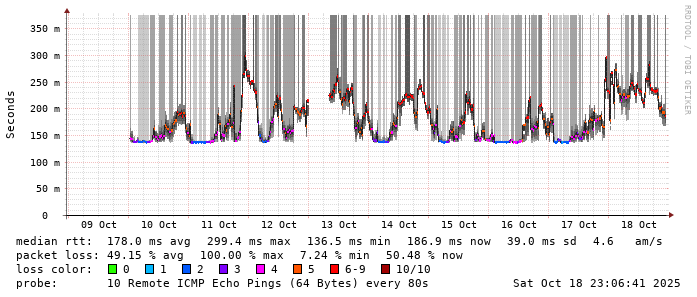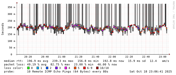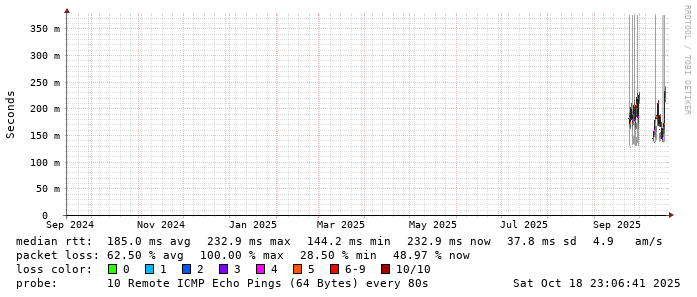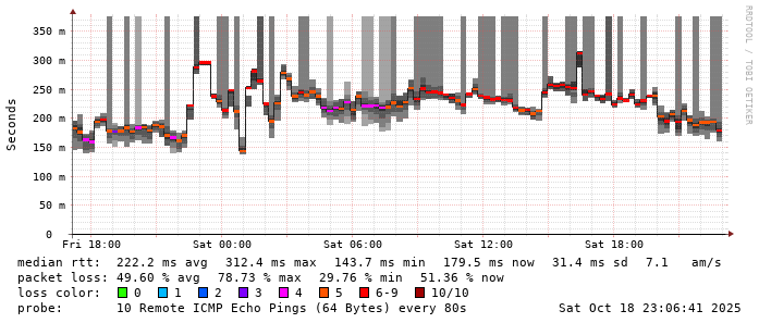 Start: 2025-10-18T12:19:54+0800HOST: ********** Loss% Snt Last Avg Best Wrst StDev 1. AS??? 100.80.0.1 0.0% 10 2.2 2.5 2.0 4.3 0.7 2. AS??? 10.240.115.70 0.0% 10 2.7 2.7 2.0 3.9 0.6 3. AS??? 10.240.115.79 0.0% 10 2.2 2.2 1.9 3.2 0.4 4. AS??? 10.240.115.175 0.0% 10 1.9 2.2 1.8 3.4 0.6 5. AS??? 10.238.224.88 0.0% 10 2.2 2.5 2.0 3.5 0.6 6. AS??? 10.209.7.77 20.0% 10 2.2 3.2 2.2 8.5 2.2 7. AS??? 10.209.4.14 60.0% 10 6.1 7.2 4.7 12.0 3.2 8. AS??? ??? 100.0 10 0.0 0.0 0.0 0.0 0.0 9. AS??? 10.209.4.145 60.0% 10 2.9 5.2 2.7 12.2 4.7 10. AS??? 10.209.4.1 60.0% 10 2.6 4.0 2.4 8.3 2.9 11. AS??? 10.209.2.2 0.0% 10 1.7 1.8 1.5 2.6 0.3 12. AS58563 119.96.254.241 0.0% 10 8.7 3.3 1.3 10.3 3.4 13. AS??? ??? 100.0 10 0.0 0.0 0.0 0.0 0.0 14. AS4134 202.97.78.153 90.0% 10 17.7 17.7 17.7 17.7 0.0 15. AS??? ??? 100.0 10 0.0 0.0 0.0 0.0 0.0 16. AS4134 202.97.39.177 80.0% 10 18.4 18.3 18.3 18.4 0.1 17. AS??? 203.86.97.10 50.0% 10 213.7 216.4 207.2 224.3 6.5 18. AS??? ??? 100.0 10 0.0 0.0 0.0 0.0 0.0 19. AS2914 ae-4.r24.taiptw01.tw.bb.gin.ntt.net 30.0% 10 192.0 192.8 185.7 202.8 5.2 20. AS2914 ae-5.a00.taiptw01.tw.bb.gin.ntt.net 30.0% 10 240.2 244.9 238.3 251.9 5.5 21. AS2914 ae-19-805.a00.taiptw01.tw.ce.gin.ntt.net 80.0% 10 244.8 242.5 240.2 244.8 3.3 22. AS??? tw52.as9678.net 55.6% 9 231.3 232.8 230.0 237.2 3.1 23. AS9678 152-151-103-232.hostinginside.com 55.6% 9 241.2 238.2 233.9 243.6 4.9